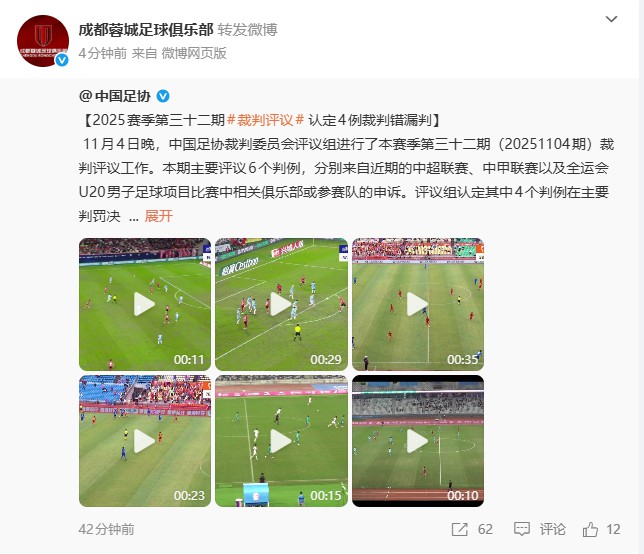 无声的抗议?成都蓉城官博转发足协评议认定成都遭错漏判内容