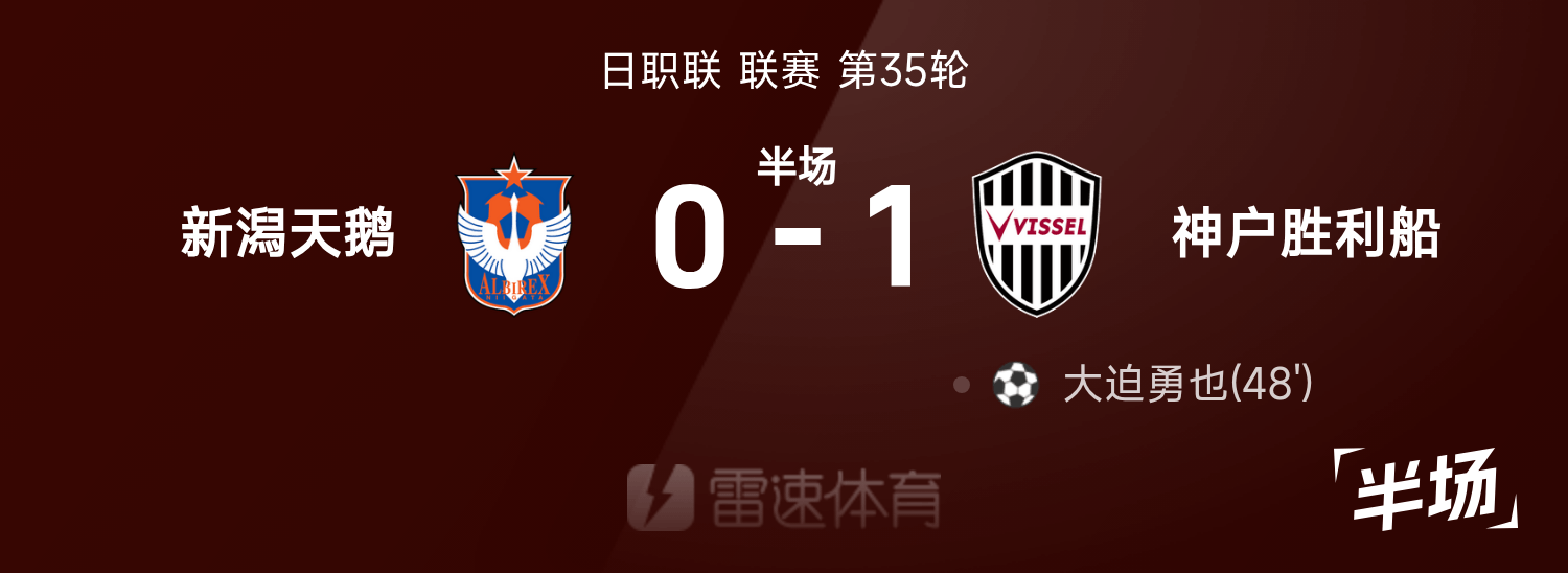 日职联半场:大迫勇也补时破门,新潟天鹅暂0-1神户胜出局船