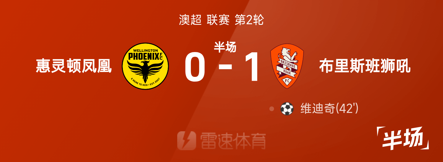 澳超半场:维迪奇反击建功,惠灵顿凤凰暂0-1布里斯班狮吼