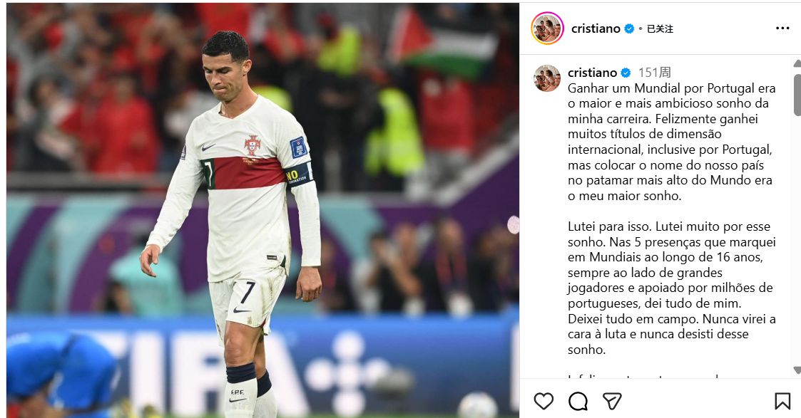 不过,C罗在2022年卡塔尔世杯赛终结后的观点与现在大相径庭。在葡萄牙爆冷不敌摩洛哥出局后,C罗在社交媒体上发文表示,为葡萄牙赢得世杯赛冠军是自己职业生涯最伟大的梦想,而且自己从未放弃过这个梦想。
