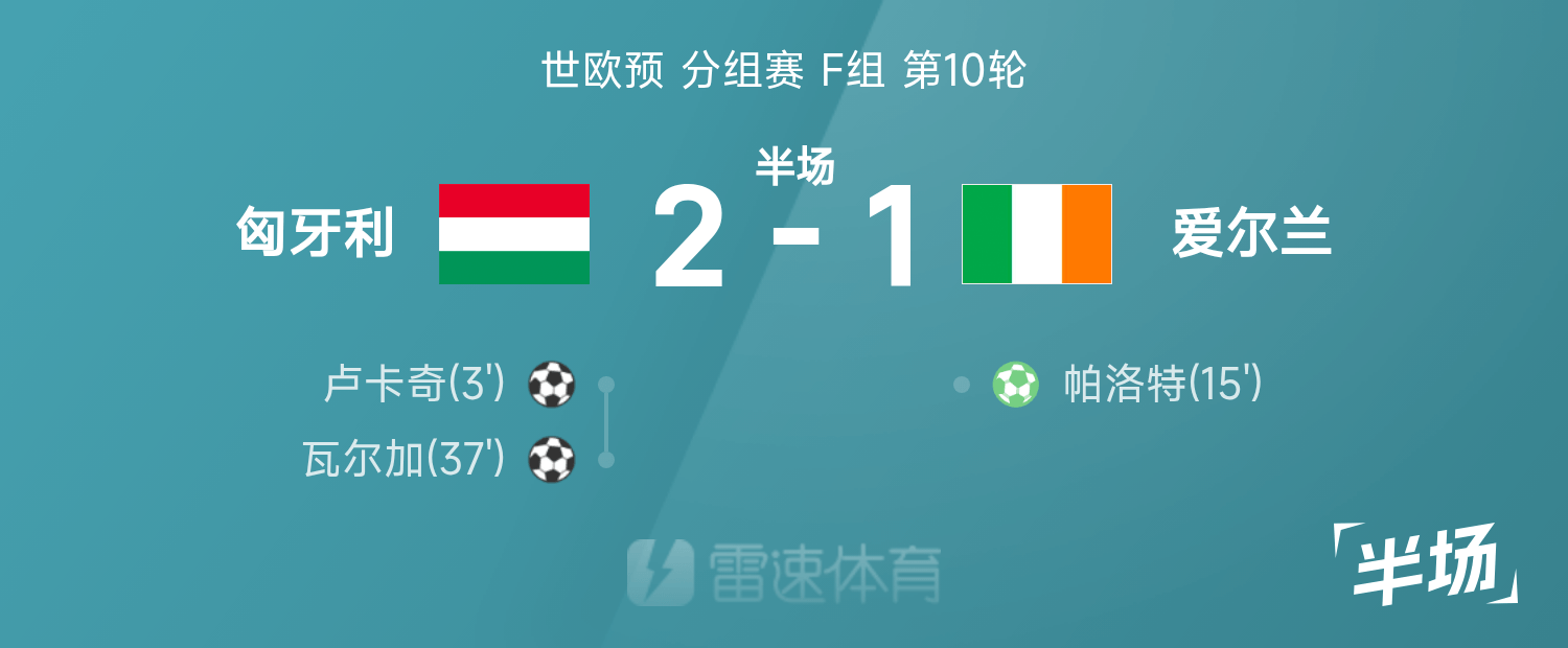 世欧预半场:瓦尔加凌空世界波,匈牙利暂2-1爱尔兰