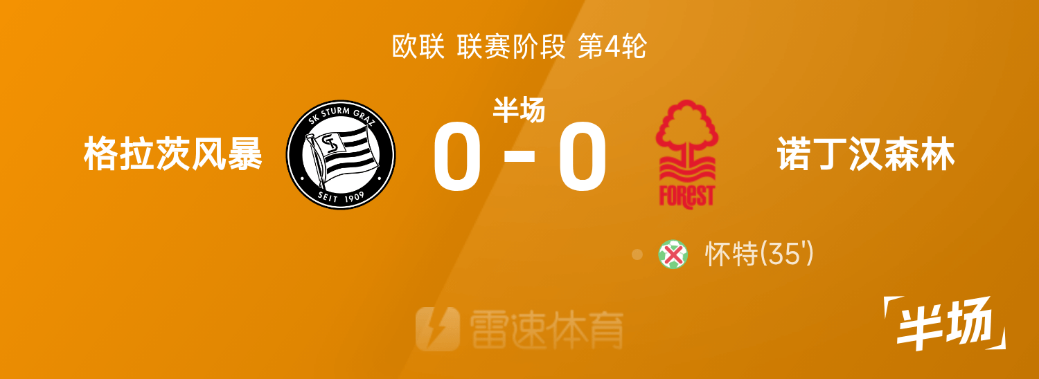 欧联半场:怀特失点,马龙进球被吹,格拉茨风暴0-0诺丁汉森林