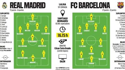 6686体育app10月26日讯 西甲第10轮将迎来万众瞩目的西班牙国家德比,皇马将坐镇在主队场迎战巴萨。西班牙媒体《每日体育报》预测了双方本场竞赛的首发阵容。