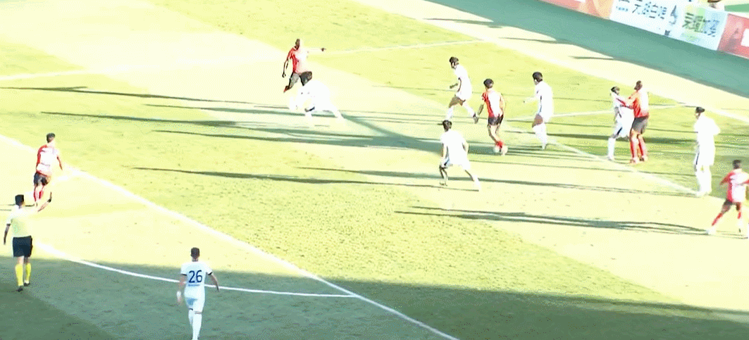 85’陈彬彬横传,贾博琰迎球打门命中,但裁判员吹陈彬彬越位在先
