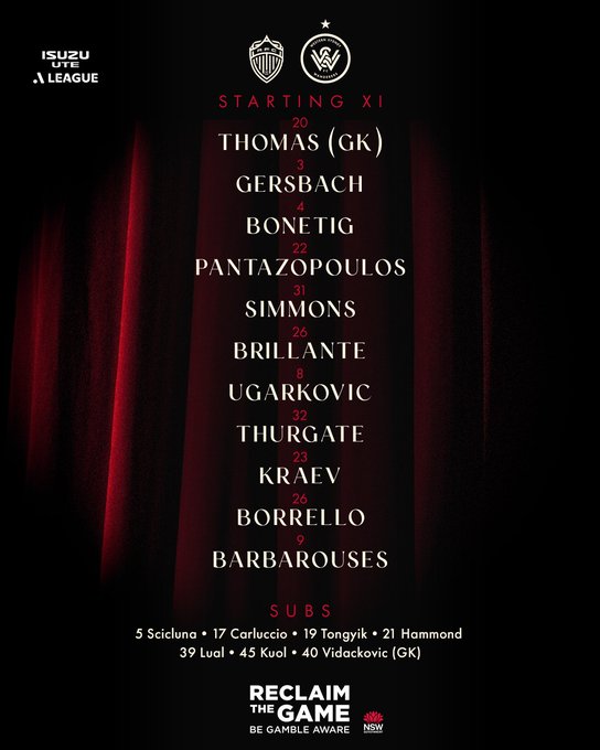 西悉尼流浪者首发阵容:20-托马斯、3-格尔斯巴赫、4-博内蒂格、31-西蒙斯、22-潘塔佐普勒斯、25-布里兰特、8-乌加尔科维奇、23-克拉耶夫、32-瑟盖特、9-巴巴洛塞斯、26-博雷洛
