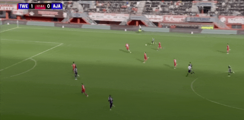 18’韦霍斯特三秒区内转身运球打出阿贾克斯全场第一脚攻门