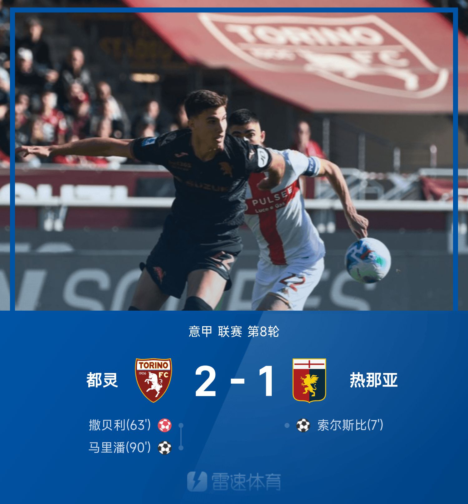 6686体育app10月26日讯 25/26赛季意甲联赛事第8轮,都灵2-1战胜热那亚。上半场索尔斯比抢点闪击得手,但下半场风云突变,撒贝利送乌龙协助都灵扳平赛果分,最后时刻中后卫马里潘完成最后一投。