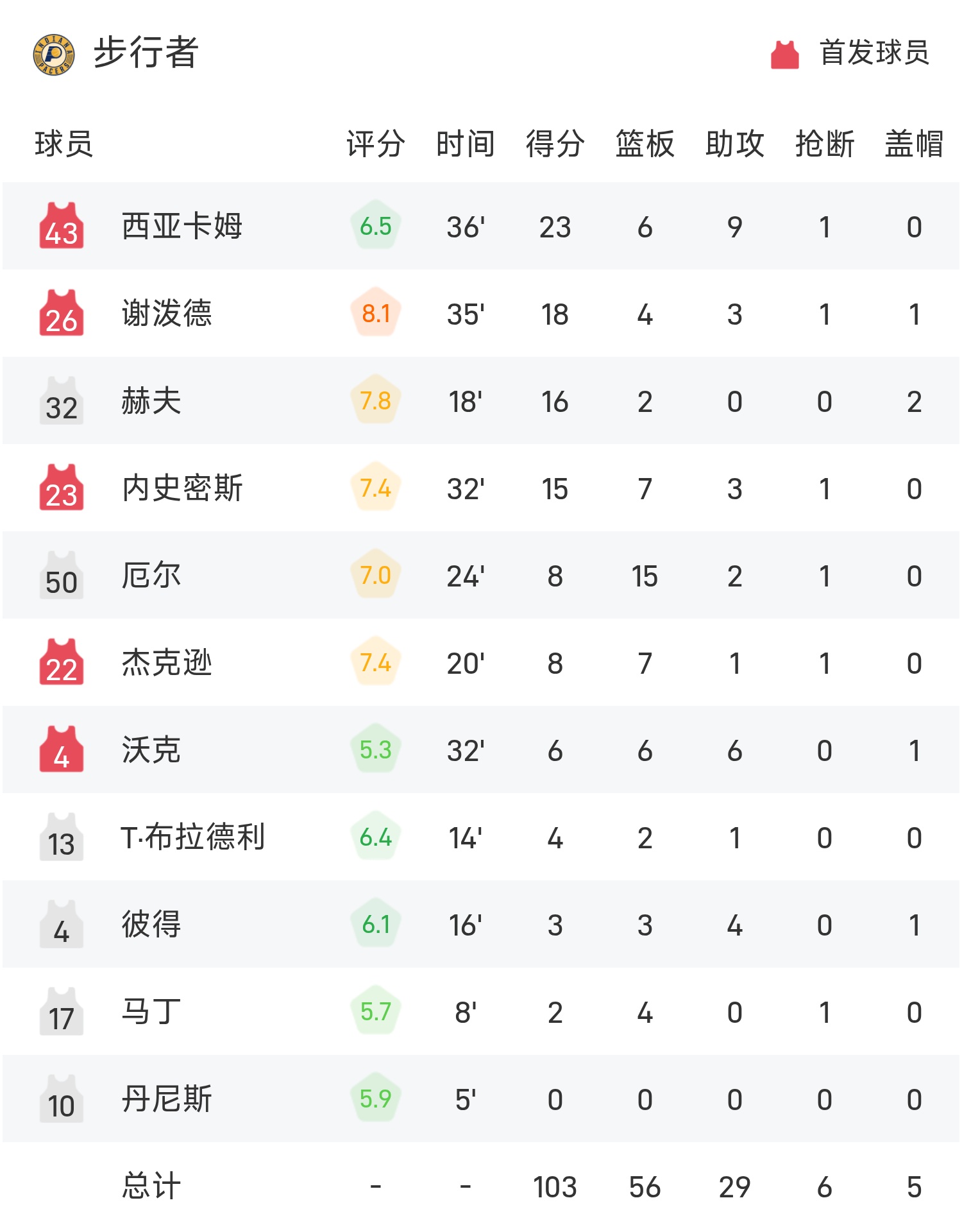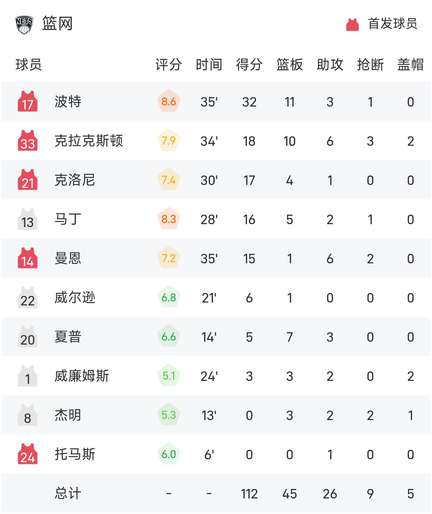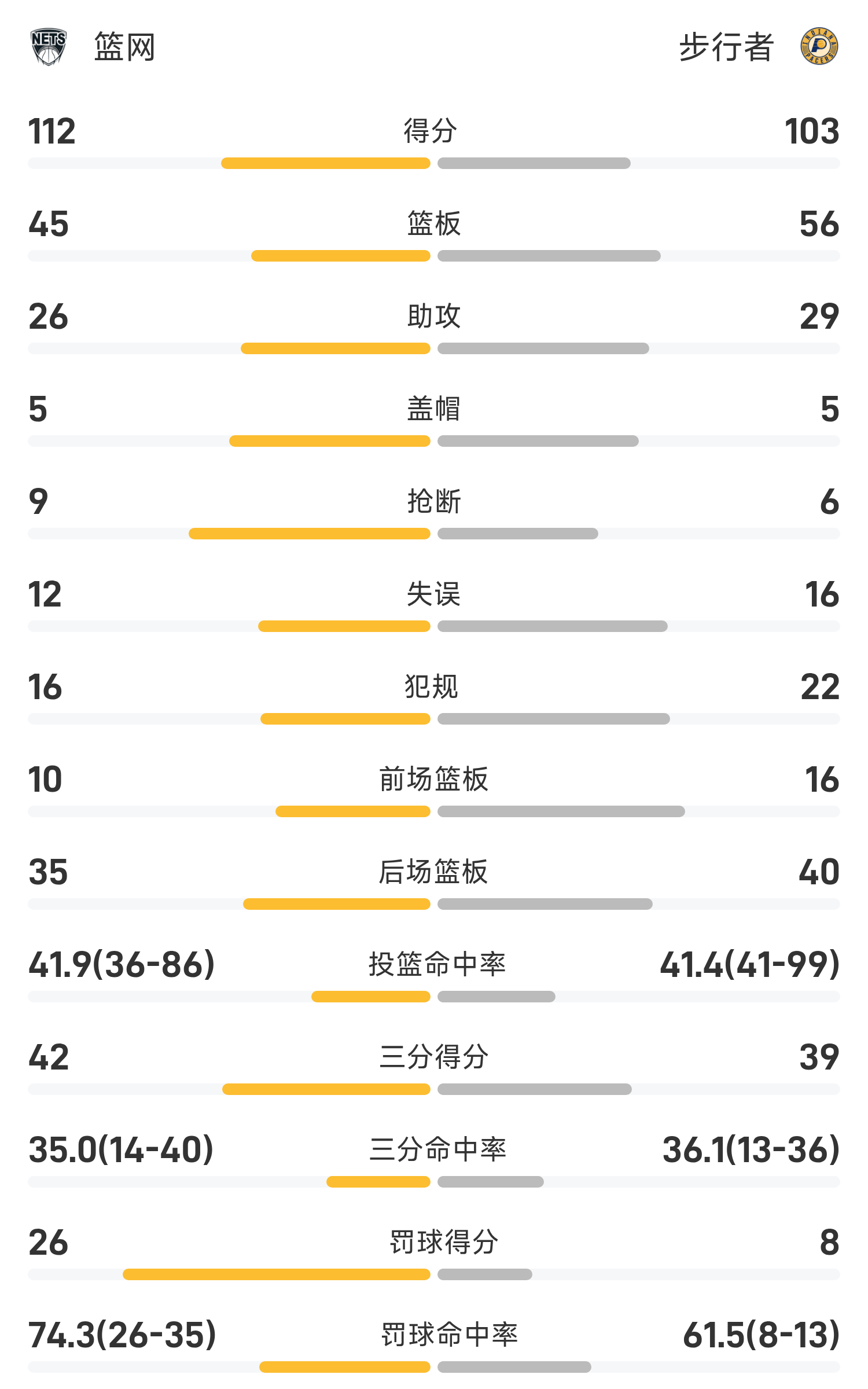 6686体育app11月06日讯 25/26赛季NBA 常规赛,步行者对阵篮网。双方全场战罢,步行者103-112不敌篮网。波特砍下全场最高的32分10板2助,率领篮网胜利取胜。