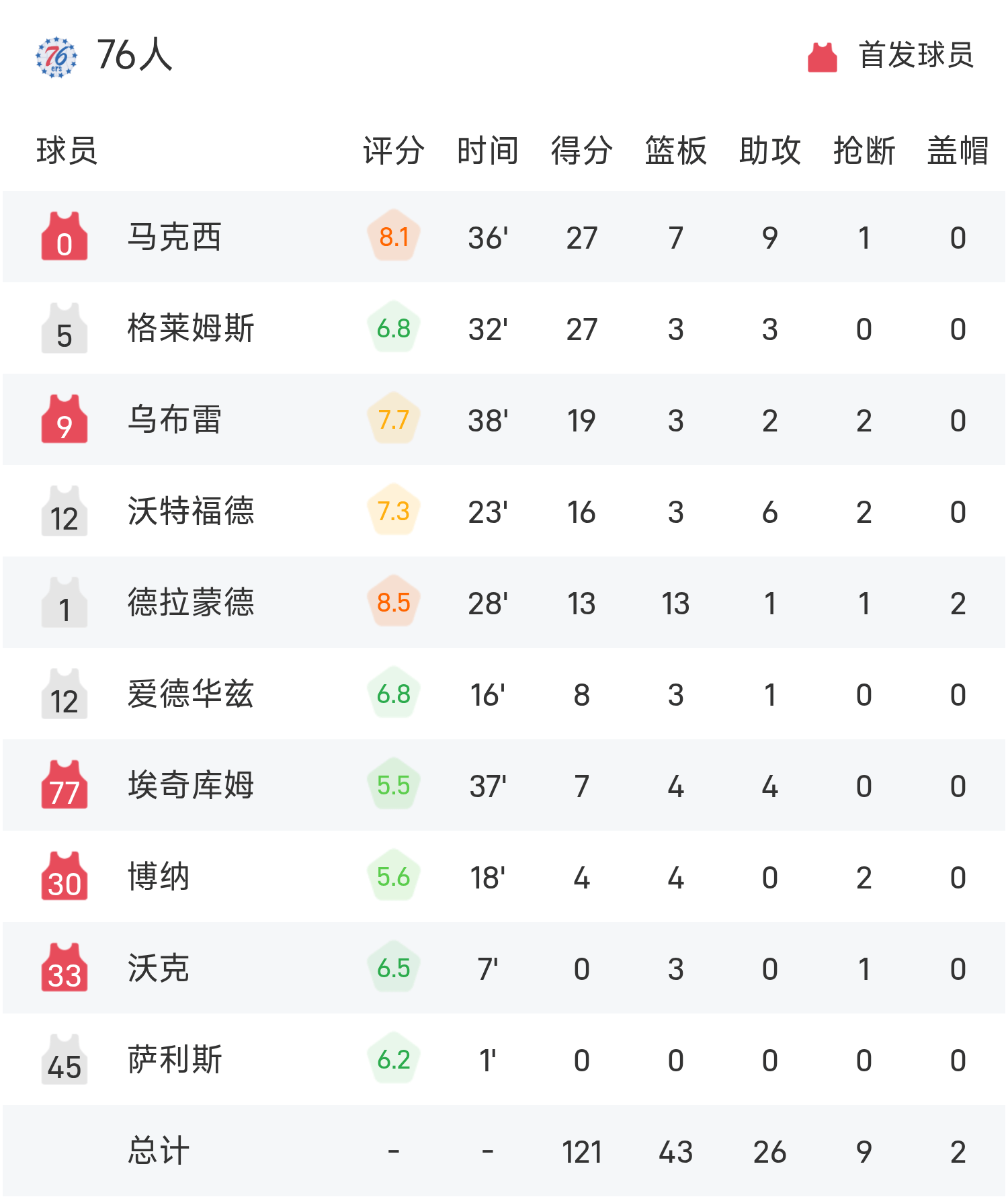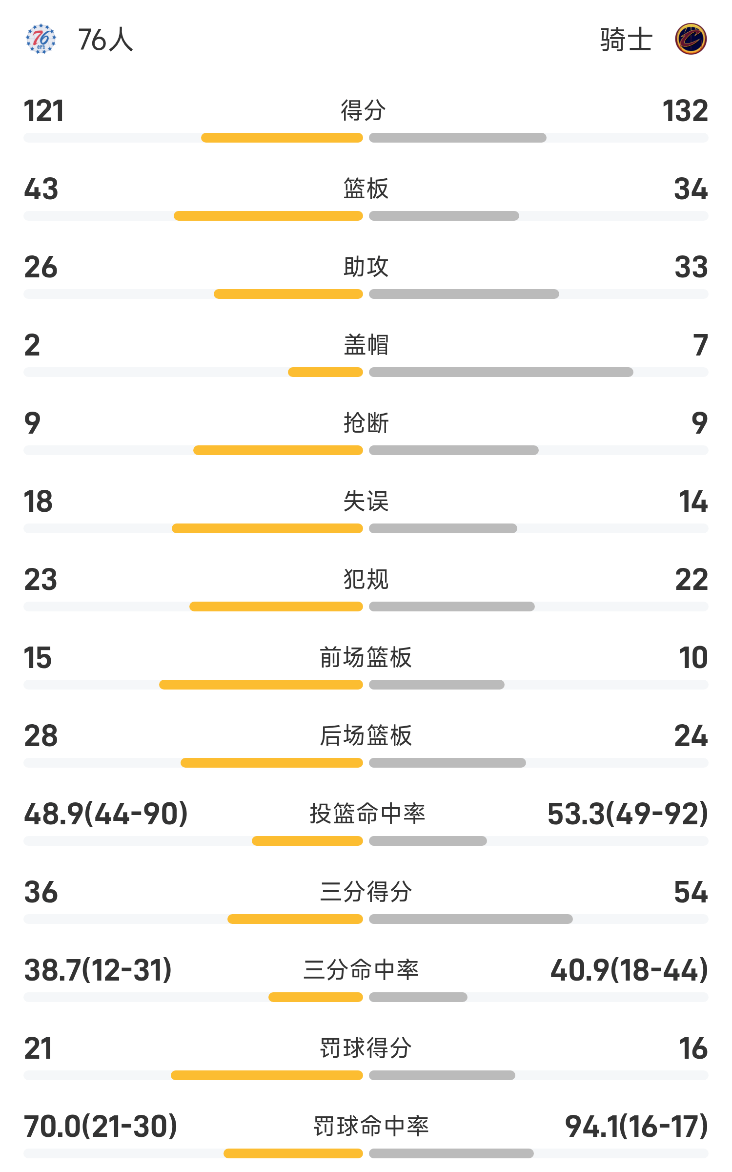 双方全场战罢,骑士132-121战胜76人。