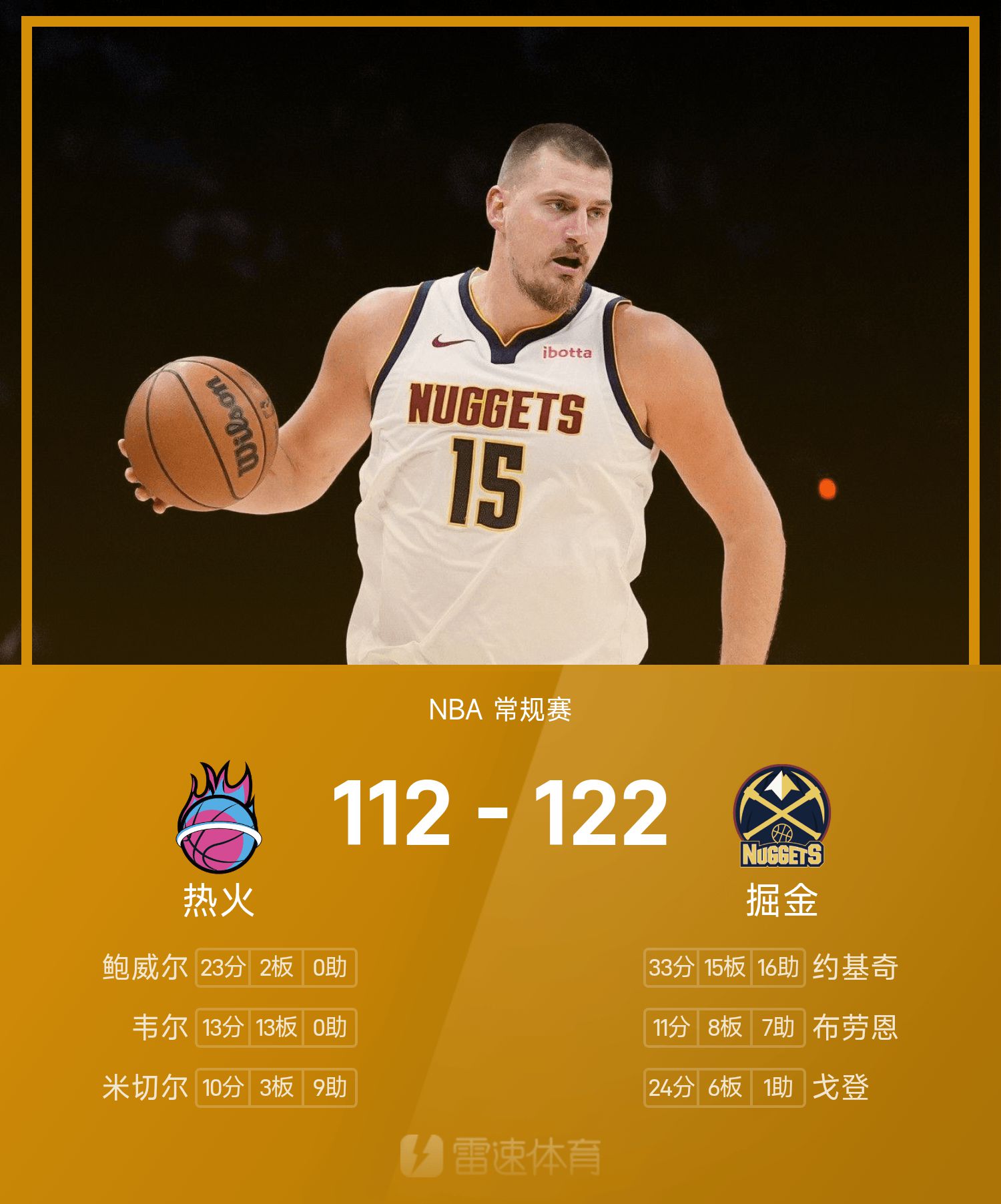 约基奇18投12中砍下33分15抢篮板16助攻,获得本赛季第五次三双。