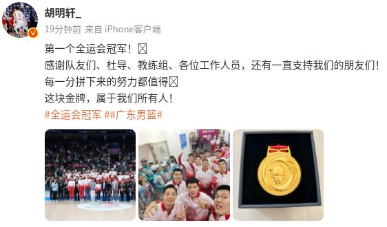 6686体育app11月13日讯 全运男篮总决赛,广东队击败浙江队,获得冠军,赛后,胡明轩在社媒发文分享自己的感想。
