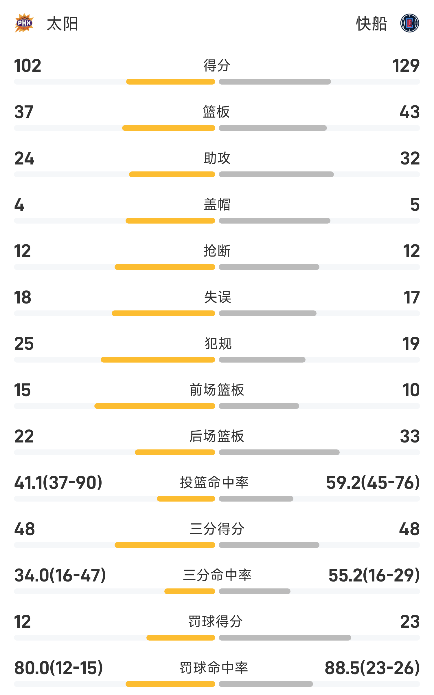 6686体育app10月25日讯 25/26赛季NBA 常规赛,快船对阵太阳。双方全场战罢,快船129-102战胜太阳。哈登砍下全场最高的30分7板7助,率领快船胜利取胜。